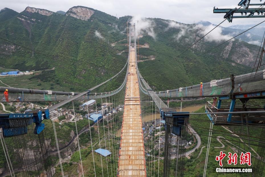 世界山区峡谷第一高塔悬索桥主跨合龙