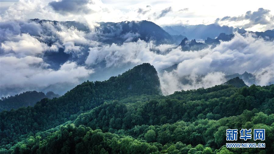 5月30日无人机拍摄的云雾缭绕的五龙洞国家森林公园景色。新华社记者 陶明 摄