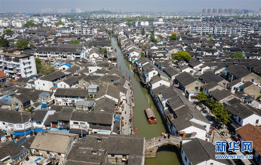 图为4月18日无人机拍摄的苏州山塘街及城景。 新华社记者 李响 摄