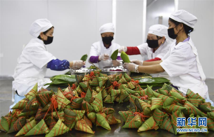 6月2日,在台江县一家食品生产企业车间,工人在包制五彩粽。 新华社发(刘开福 摄)