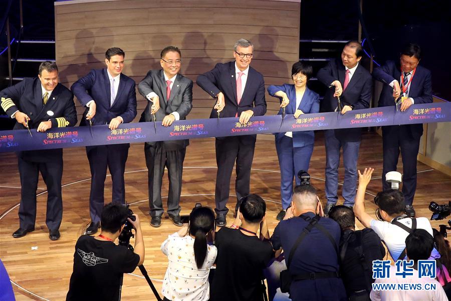 6月3日,“海洋光谱号”邮轮在上海吴淞口国际邮轮港举行剪彩庆典仪式。 当日,经过为期47天的环球之旅,皇家加勒比邮轮“海洋光谱号”搭载近5000名国际游客靠泊上海吴淞口国际邮轮港,这也是自2011年上海吴淞口国际邮轮港开港以来迎来的第2000艘次母港邮轮。 新华社记者 陈飞 摄