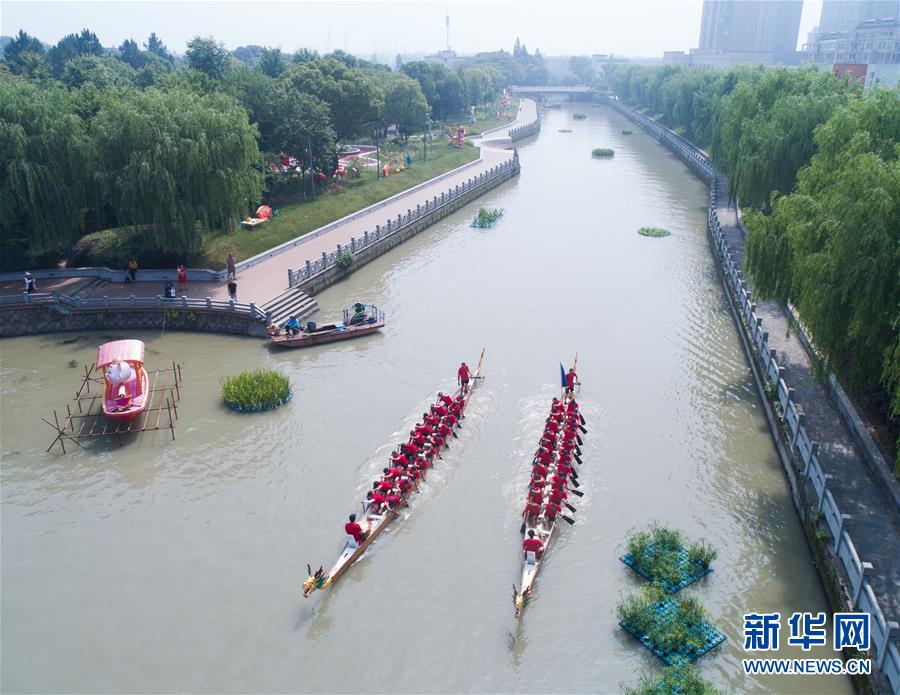 6月4日,桐乡市洲泉镇的龙舟队在湘溪公园旁的河道中开展训练,他们将代表桐乡参加2019嘉兴端午民俗文化节的龙舟竞渡(无人机拍摄)。新华社记者 徐昱 摄 图片来源:新华网