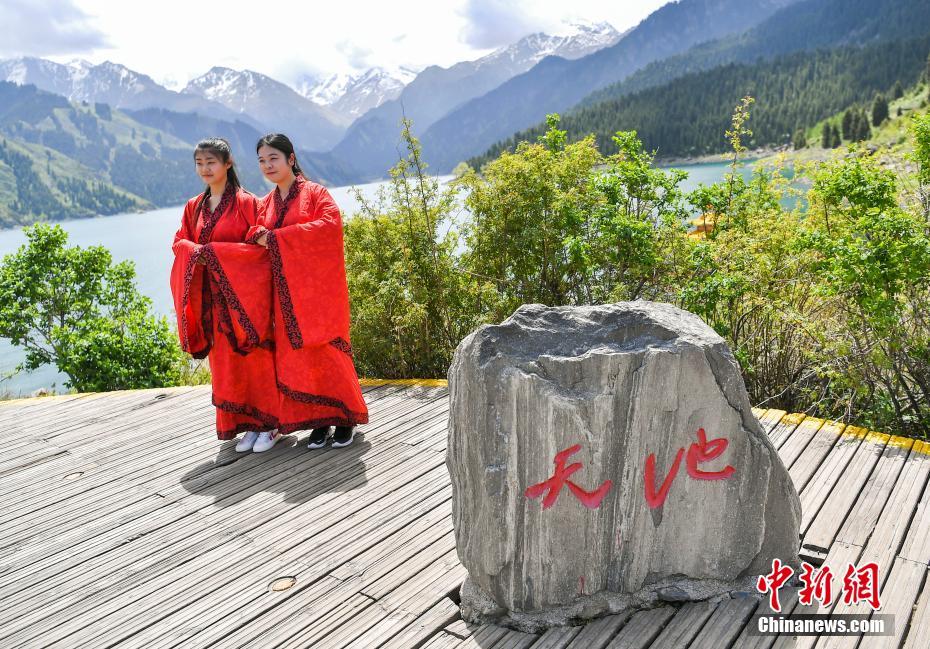 6月6日,游客穿上汉服在新疆著名的天山天池景区留影。当天,该景区举行迎端午活动,向游客赠送粽子、艾草香囊,天山脚下天池湖畔的太极扇表演,现场书法创作等吸引众多游客观赏。中新社记者 刘新 摄