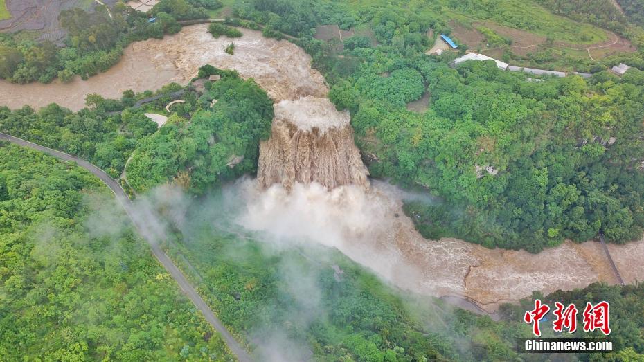 6月7日,俯瞰黄果树瀑布。当日,据贵州省安顺市水文水资源局黄果树水文监测站实测资料显示,上午9时,黄果树瀑布洪峰流量达463立方米每秒,创2019年入汛以来最大洪峰。中新社发 陈熙 摄