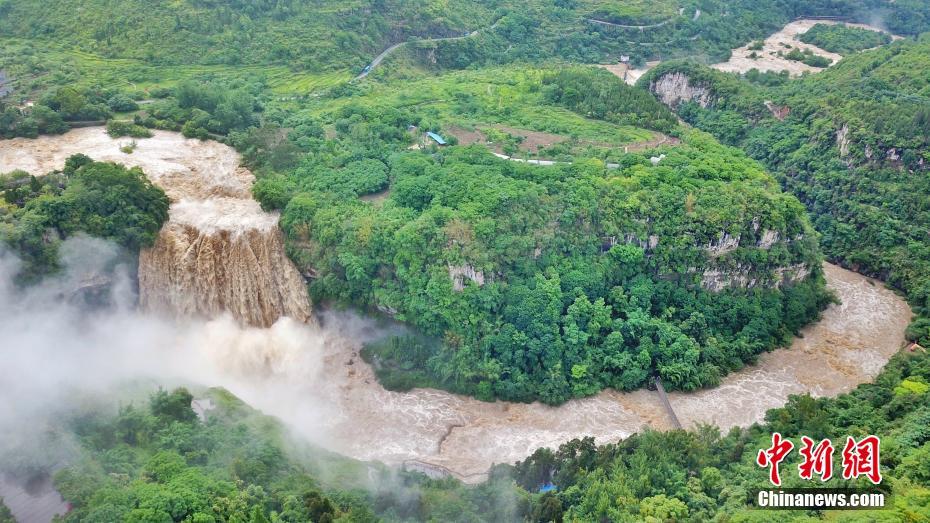 6月7日,俯瞰黄果树瀑布。当日,据贵州省安顺市水文水资源局黄果树水文监测站实测资料显示,上午9时,黄果树瀑布洪峰流量达463立方米每秒,创2019年入汛以来最大洪峰。中新社发 陈熙 摄
