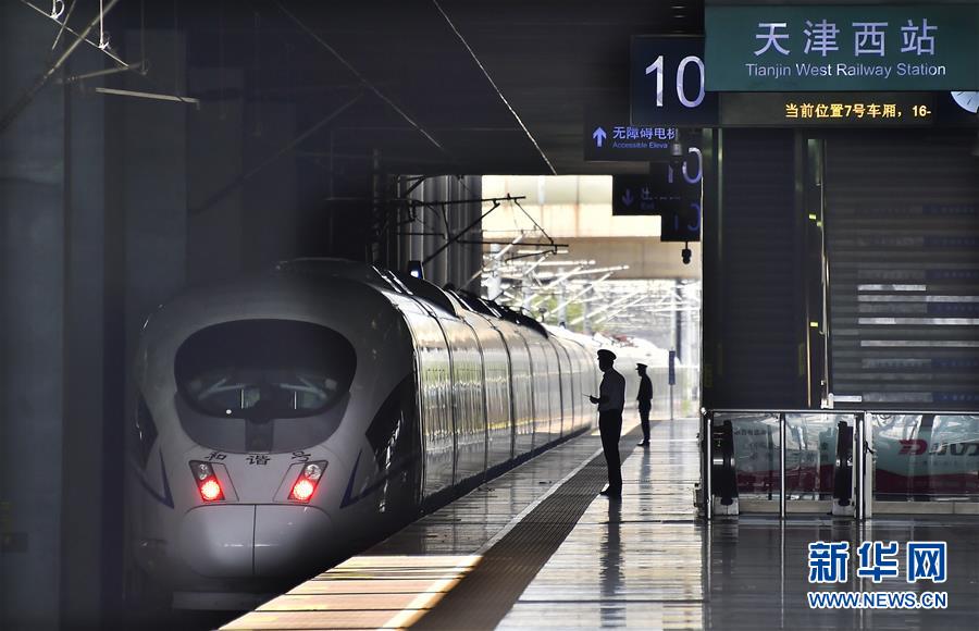 6月9日,一列高铁动车组列车驶出天津西站。 据悉,全国铁路9日迎来端午小长假返程客流高峰,预计发送旅客1370万人次,加开旅客列车889列。 新华社发(杨宝森摄)