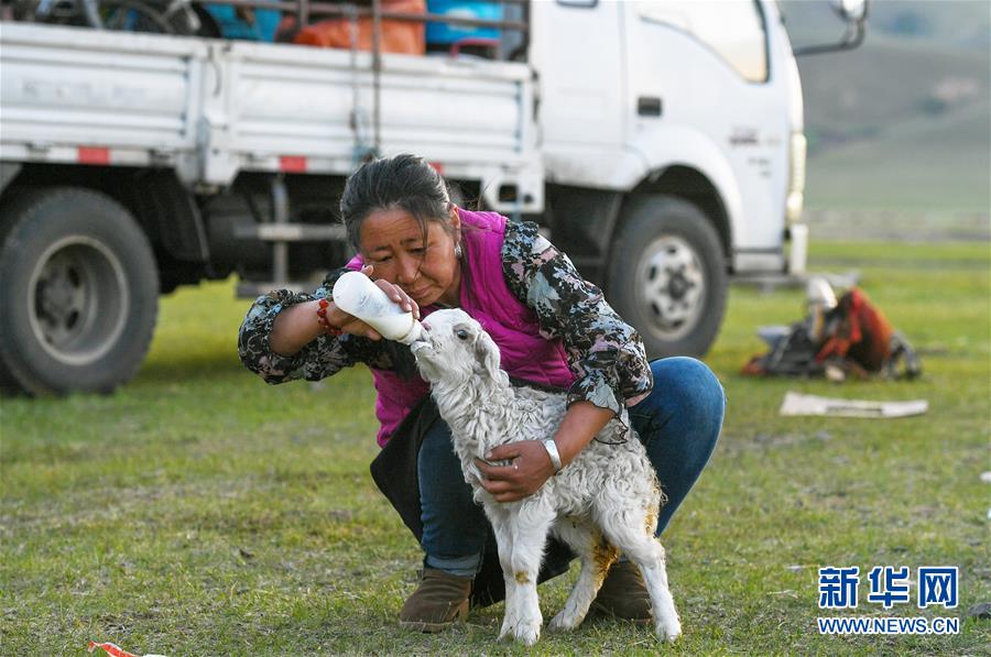 6月1日,和喜格都冷的家人给刚出生不久的小羊羔喂奶。 新华社记者 彭源 摄