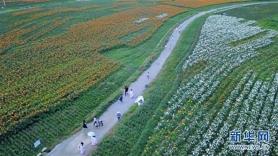 6月8日,游客在贵州省台江县老屯乡百合种植基地赏花(无人机拍摄)。 新华社记者 杨文斌 摄