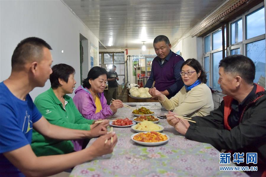 迪尔达什·木提(右三)为游客上菜(6月6日摄)。 新华社记者 丁磊 摄