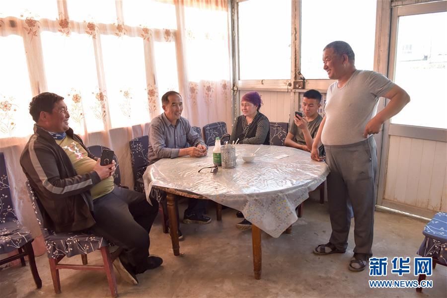 迪尔达什·木提(右一)与来客栈休息的牧民聊天(6月6日摄)。 新华社记者 丁磊 摄