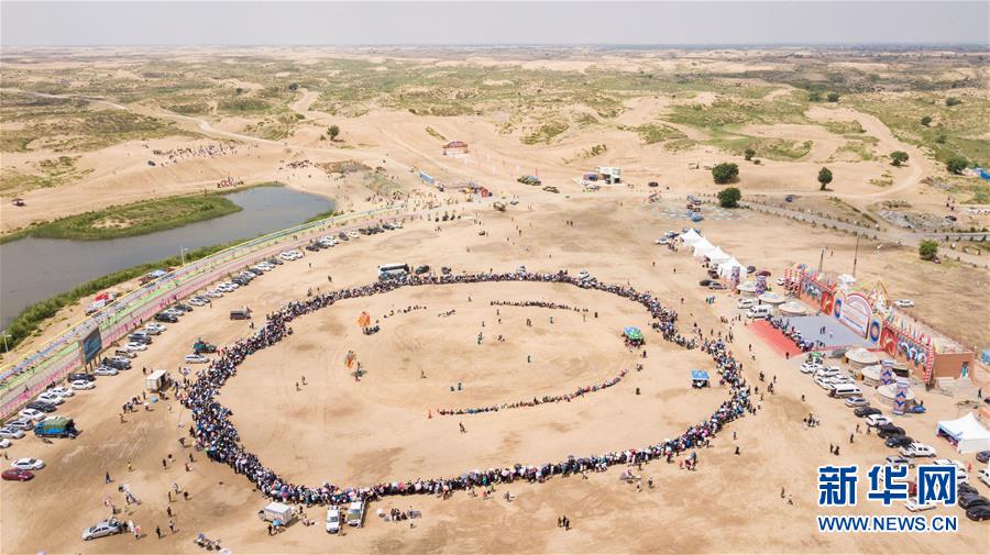 这是6月10日在内蒙古通辽市奈曼旗境内的宝古图沙漠中拍摄的搏克赛现场(无人机拍摄)。 近日,一场别开生面的沙漠那达慕在内蒙古通辽市奈曼旗境内的宝古图沙漠中举行,活动包括了赛马、赛驼、搏克等蒙古族传统项目,吸引众多游客前来观看。 新华社记者 彭源 摄