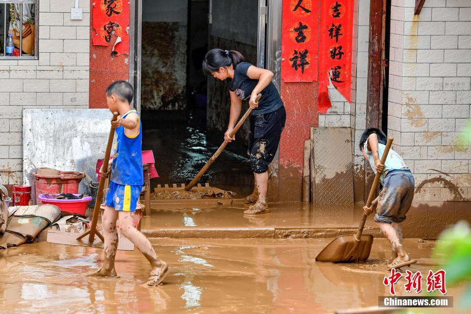 6月11日,广东省河源市连平县上坪镇居民清理房屋内的淤泥。据广东省河源市防汛防旱防风指挥部办公室统计,截至6月11日,暴雨导致河源全市63个乡镇不同程度受灾,因灾死亡7人,失联1人,受伤3人,受灾人口11.455万人,倒塌房屋956间,转移人口1.454万人。 其中,连平县部分乡镇受灾较严重,因灾死亡6人(4女2男),直接经济损失约1.5亿元人民币。中新社记者 陈骥旻 摄
