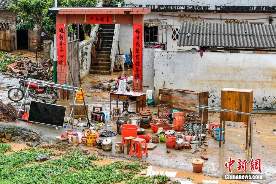 6月11日,广东省河源市连平县上坪镇居民在屋内家具搬出室外清理。据广东省河源市防汛防旱防风指挥部办公室统计,截至6月11日,暴雨导致河源全市63个乡镇不同程度受灾,因灾死亡7人,失联1人,受伤3人,受灾人口11.455万人,倒塌房屋956间,转移人口1.454万人。 其中,连平县部分乡镇受灾较严重,因灾死亡6人(4女2男),直接经济损失约1.5亿元人民币。中新社记者 陈骥旻 摄
