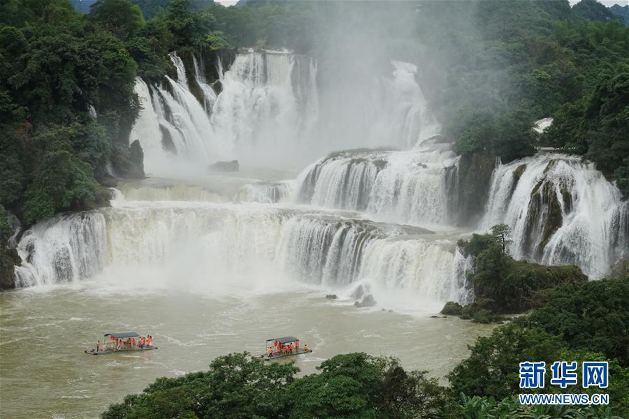 进入6月,由于雨量充沛,位于中国与越南边境的广西崇左市大新县德天瀑布进入最佳观赏期,吸引大批游客前来观赏。德天瀑布与紧邻的越南板约瀑布相连,是亚洲最大跨国瀑布。新华社发(喻湘泉 摄)