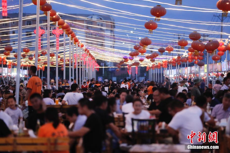 6月14日,新疆哈密市政府与中国红十字基金会以及多家互联网媒体共同启动“一元公益游哈密”活动,活动以“旅游+公益”方式打造“丝路名城·甜美哈密”新形象。游客最低捐出一元钱支持景区红十字救护站项目就可参与“吃瓜打卡”活动,免费吃瓜、免费游览哈密各景点景区。图为哈密宝农“七一”夜市吸引游客消夏纳凉。中新社记者 杜洋 摄