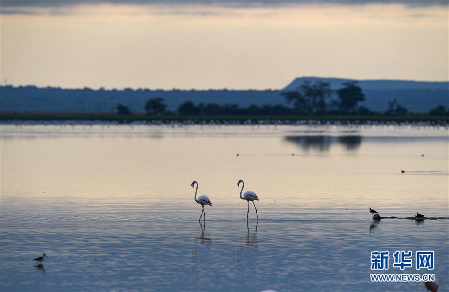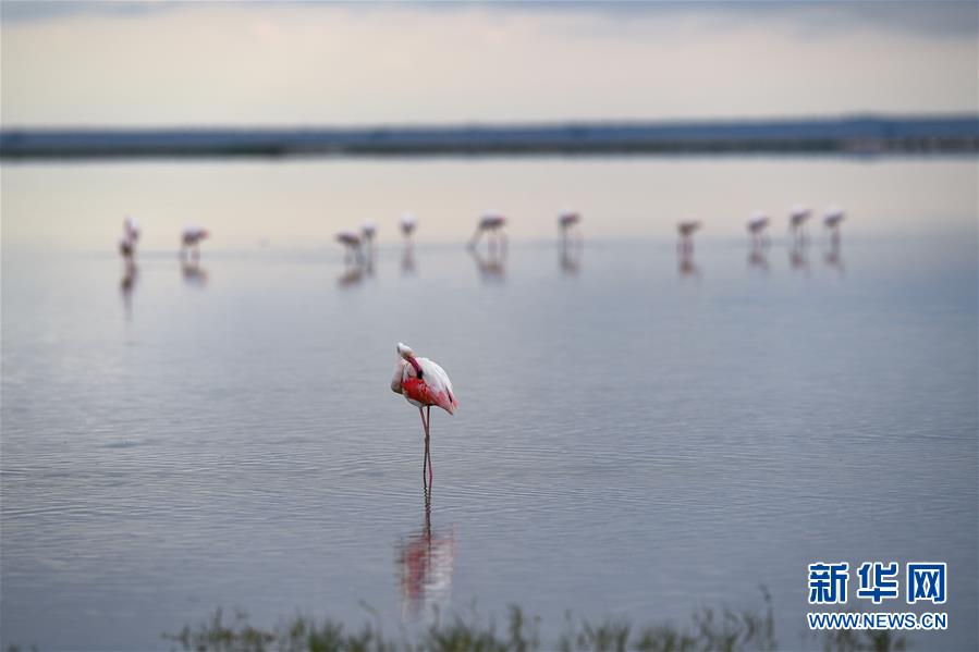 6月16日,火烈鸟在肯尼亚安博塞利国家公园觅食。 新华社记者 李琰 摄