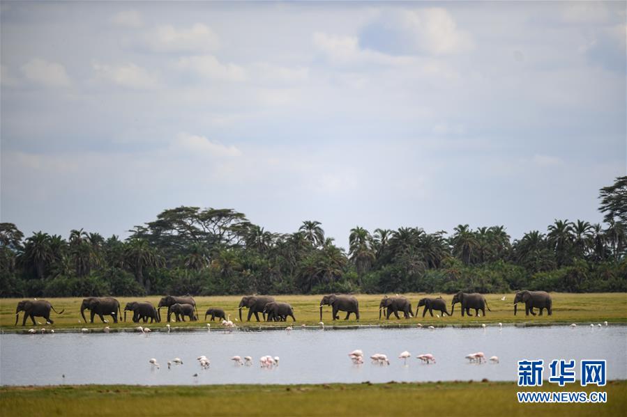6月15日,象群从肯尼亚安博塞利国家公园的湖边走过。 新华社记者 李琰 摄
