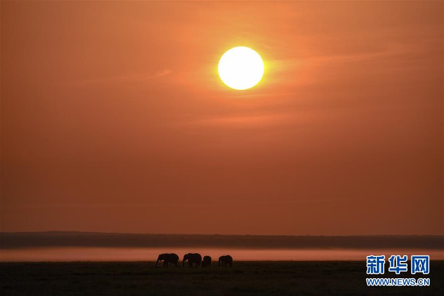 6月16日日出时分,大象在肯尼亚安博塞利国家公园觅食。 新华社记者 李琰 摄
