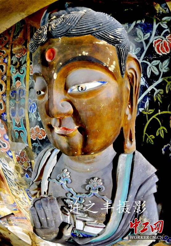 云冈石窟距今已有1500多年的历史,它始建于公元460年。位于山西省大同市,石窟依山开凿,东西绵延1公里。存有主要洞窟45个,大小窟龛252个,石雕造像51000余躯,为中国规模最大的古代石窟群之一。作者站在云梯上拍摄云冈石雕。工人日报-中工网许之丰摄影报道