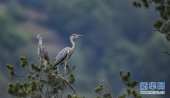 6月18日,两只苍鹭栖息在白皮松树上。 在秦岭深处的陕西省洛南县石坡镇周湾村,每年春天都有近百只苍鹭从南方迁徙而来,在山坡上3棵相拥而立的高大白皮松树上筑巢垒窝、展翅翱翔,成为当地一处独有的自然景观。 新华社发(王沛摄)