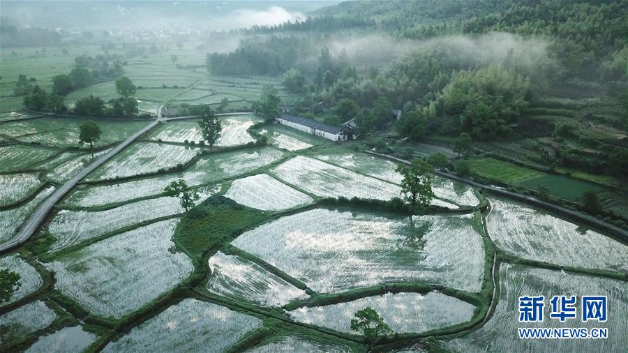 这是6月23日清晨在安徽黟县宏村风景区拍摄的一处农田(无人机拍摄)。