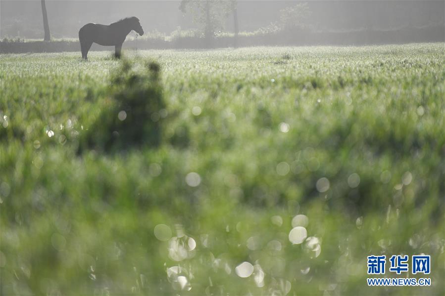 6月23日,在安徽省黟县宏村风景区,马匹沐浴在晨光中。