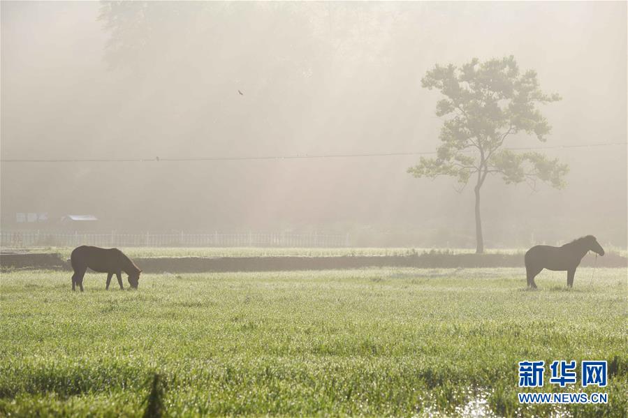 6月23日,在安徽省黟县宏村风景区,马匹沐浴在晨光中。