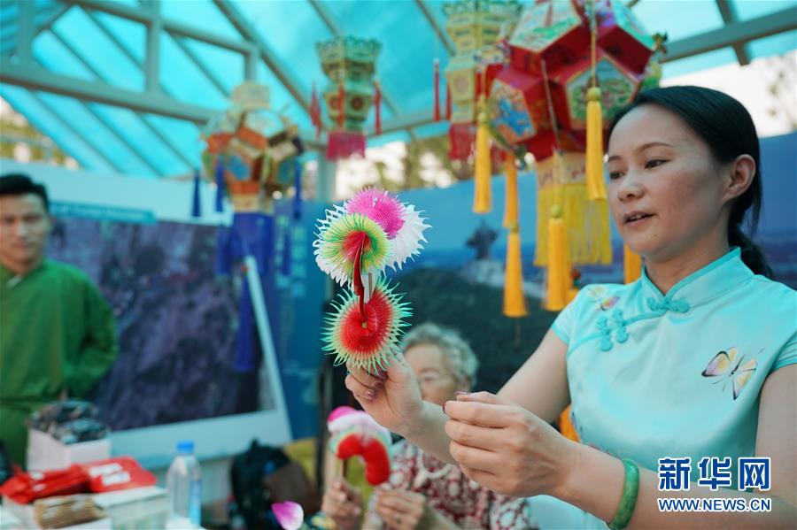 6月23日,来自河南省开封市的张俊丽(右)在“河南日”活动上展示使用制作汴京灯笼余料制作的“汴花”。 新华社记者鞠焕宗摄