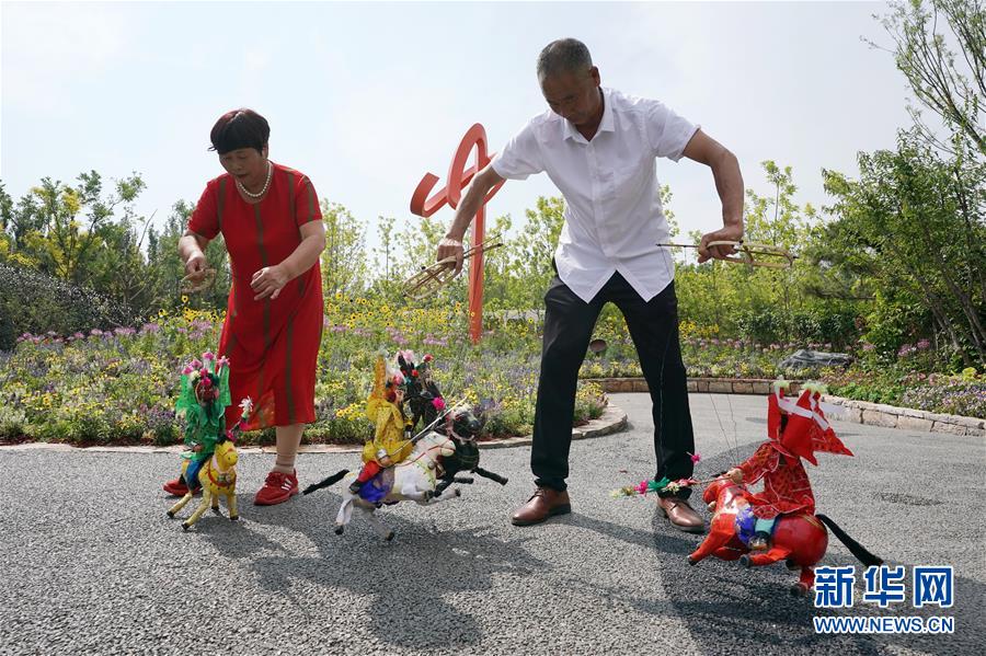 6月23日,来自河南省宝丰县的娄艳俊(右)在河南园内表演提线木偶戏《三英战吕布》。新华社记者鞠焕宗摄