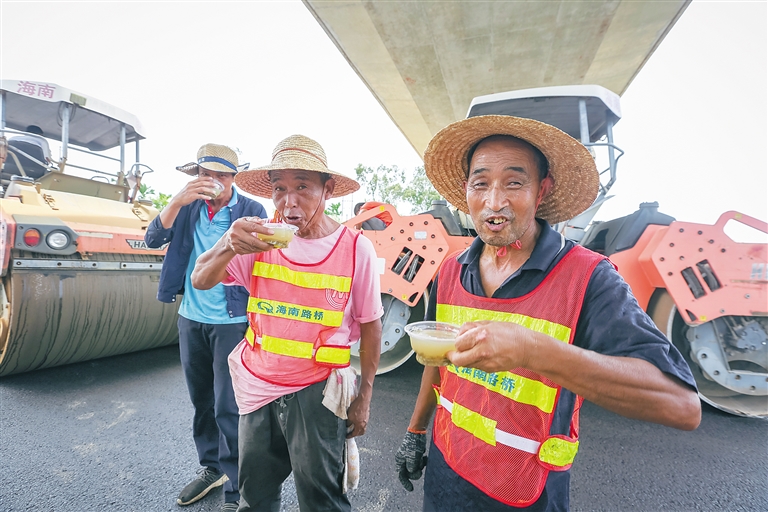 6月23日,在万洋高速万宁段,工人师傅喝绿豆汤解暑。海南日报记者 袁琛 摄