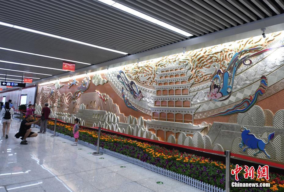 6月23日,兰州市轨道交通1号线东方红广场站内的敦煌飞天浮雕吸引民众拍照。当日,兰州市轨道交通1号线一期工程正式开通试运营。中新社记者 杨艳敏 摄