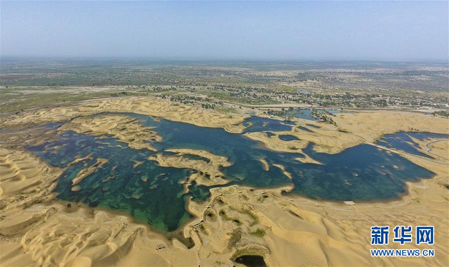 这是罗布人村寨内的神女湖景点(6月19日无人机拍摄)。 入夏以来,新疆尉犁县罗布人村寨景区迎来旅游旺季。根据景区提供的数据,自“五一”小长假至6月23日,罗布人村寨接待游客5.2万多人次,相比去年同期增长约78%。 新华社记者 赵戈 摄