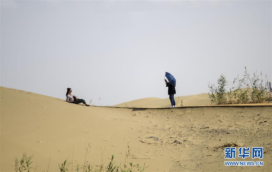 游客在罗布人村寨里拍照(6月19日摄)。 入夏以来,新疆尉犁县罗布人村寨景区迎来旅游旺季。根据景区提供的数据,自“五一”小长假至6月23日,罗布人村寨接待游客5.2万多人次,相比去年同期增长约78%。 新华社记者 赵戈 摄