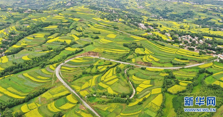 这是在积石山保安族东乡族撒拉族自治县拍摄的油菜花梯田(6月24日无人机拍摄)。 近日,甘肃省积石山保安族东乡族撒拉族自治县山乡油菜花盛开,美如画卷。 新华社发(史有东 摄)