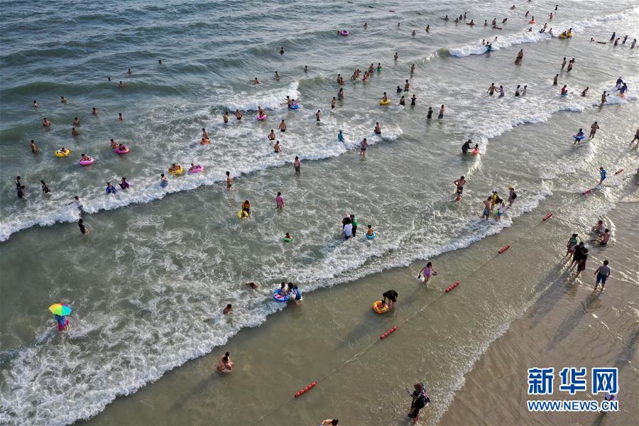 6月25日,游客在广西北海市银滩游玩(无人机拍摄)。 近日,广西北海市银滩进入旅游旺季。 新华社记者 陆波岸 摄