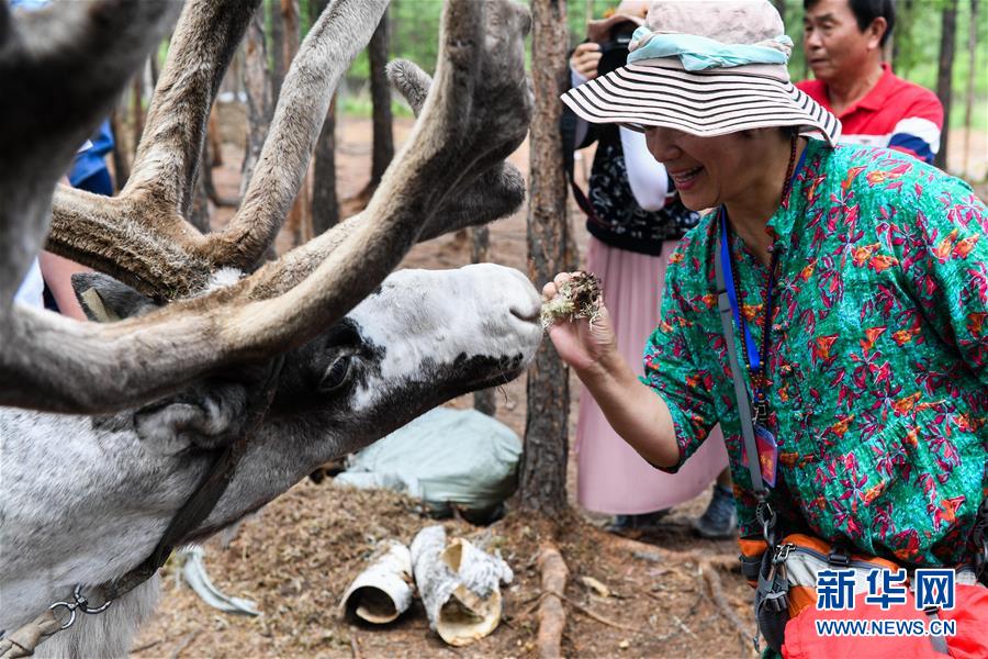 6月25日,游客在敖鲁古雅原始部落旅游景区与动物近距离接触。 进入夏季,内蒙古根河市敖鲁古雅鄂温克族乡迎来旅游旺季,不少游客到此游玩,体验独特的鄂温克民族风情。2003年,敖鲁古雅鄂温克族乡的猎民从山上原始林区搬到根河市西郊,并在当地政府的支持下通过发展旅游业增收。 新华社记者 刘磊 摄