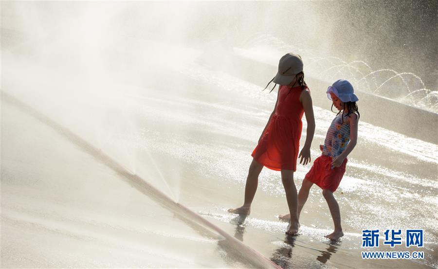 6月26日,儿童在奥地利维也纳施瓦岑贝格广场戏水消暑。 当日,维也纳最高气温达到36摄氏度,不少居民来到喷泉和水雾喷洒设施旁降温消暑。 新华社记者 郭晨 摄