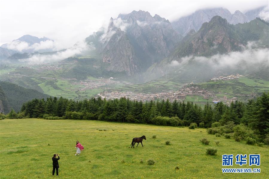 6月26日,游客在扎尕那景区游览拍照。扎尕那景区位于甘肃省甘南藏族自治州迭部县益哇乡,扎尕那是藏语,意为“石匣子”,整个景区平均海拔在3000米以上,群山环抱,松柏成林,藏式村落掩映其中,构成独特的人文和自然景观。晨雾中的扎尕那景区宛如仙境,美不胜收。新华社记者 马宁 摄