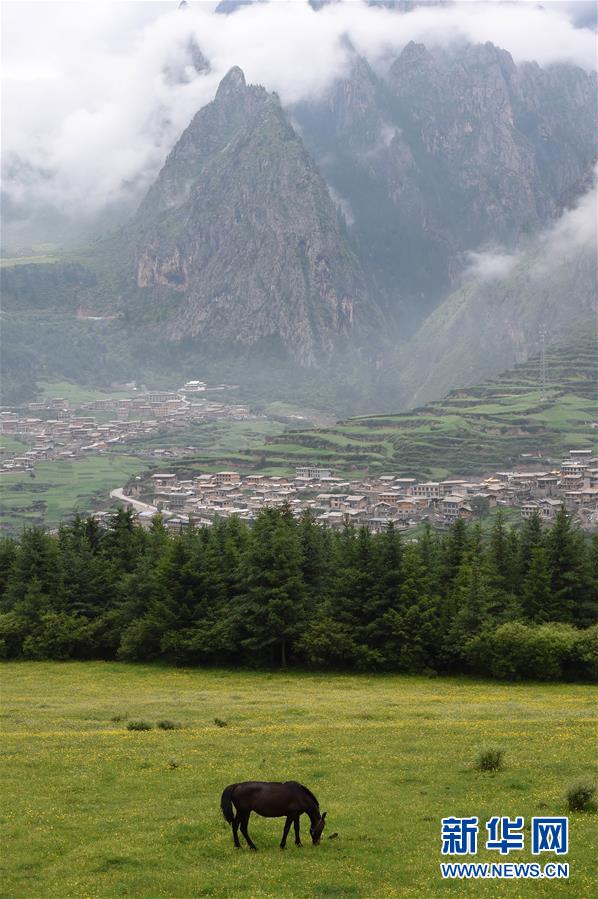 6月26日拍摄的扎尕那景区。扎尕那景区位于甘肃省甘南藏族自治州迭部县益哇乡,扎尕那是藏语,意为“石匣子”,整个景区平均海拔在3000米以上,群山环抱,松柏成林,藏式村落掩映其中,构成独特的人文和自然景观。晨雾中的扎尕那景区宛如仙境,美不胜收。新华社记者 马宁 摄