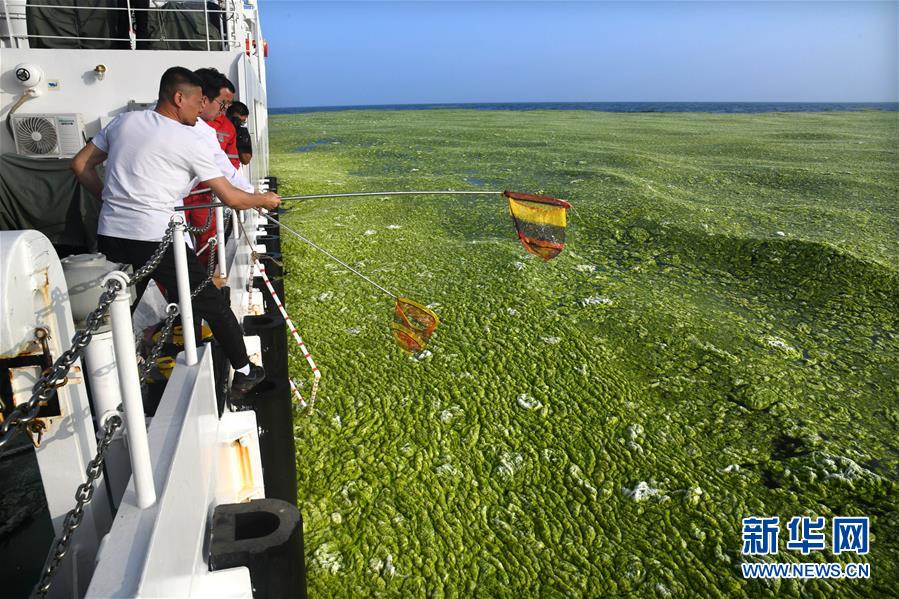 6月27日,自然资源部北海局海洋监测人员在打捞浒苔。新华社记者 李紫恒 摄