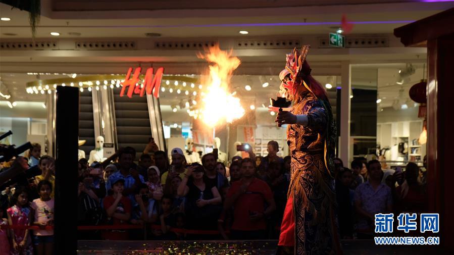 6月27日,在摩洛哥卡萨布兰卡的摩洛哥购物中心,民众观看川剧喷火表演。 位于摩洛哥最大城市卡萨布兰卡的摩洛哥购物中心27日举办中国主题购物节开幕式,吸引了数千民众参加。 新华社记者 陈斌杰 摄