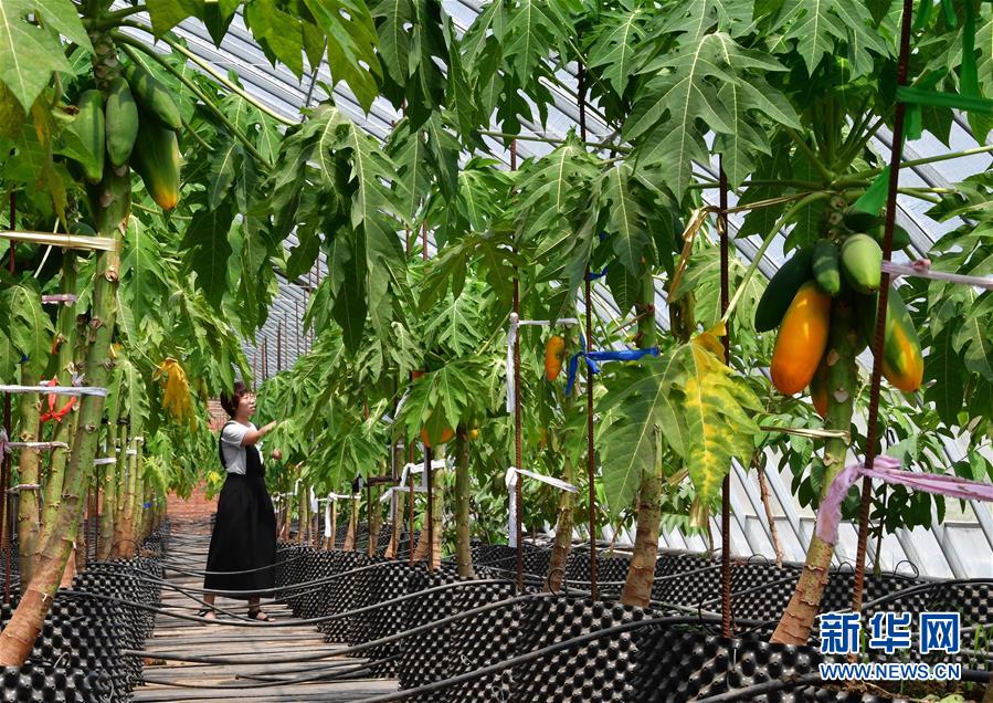 7月1日,滦州市九百户镇九百户村鸡冠山生态农业产业园的工人在管理木瓜树。 近年来,河北省滦州市九百户镇九百户村引入社会资金进行荒山开垦发展生态农业,取得良好效果。目前该村荒山生态治理面积达8000亩,以种植特色蔬菜和瓜果为主导产业,发展桃、杏、李子、核桃和部分南方瓜果生产,走上生态农业科技致富之路。 新华社记者 杨世尧 摄