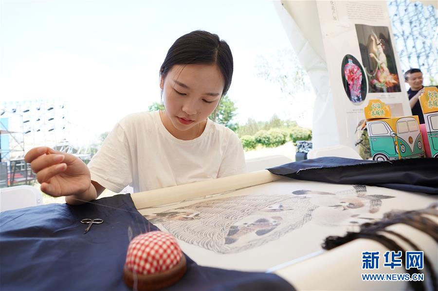 7月4日,工作人员在“湖北日”活动上展示大冶刺绣。 当日,2019年中国北京世界园艺博览会“湖北日”活动在北京世园会园区举行。 新华社记者 鞠焕宗 摄