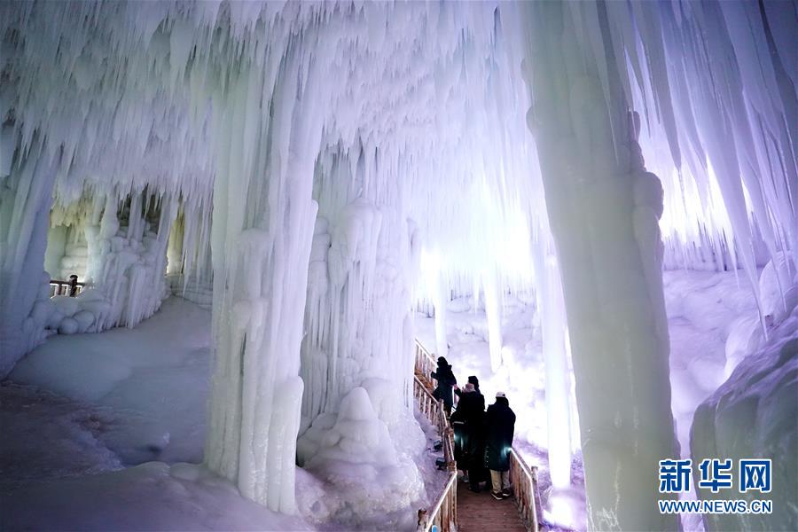 7月5日,游客在云丘山1号冰洞参观。 位于山西省乡宁县的云丘山冰洞群,四壁皆冰,常年不化。目前开放的1号冰洞总长100余米,最宽处约12米,最高处约15米。洞中的冰笋、冰柱、冰瀑晶莹剔透,在灯光的照射下呈现出梦幻般的景象。 新华社记者 詹彦 摄