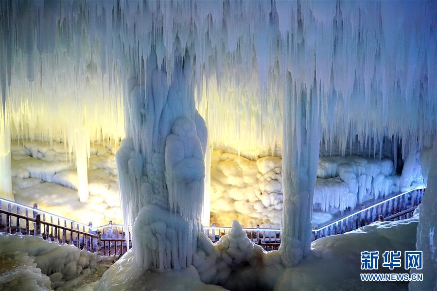 这是7月5日拍摄的云丘山1号冰洞。 位于山西省乡宁县的云丘山冰洞群,四壁皆冰,常年不化。目前开放的1号冰洞总长100余米,最宽处约12米,最高处约15米。洞中的冰笋、冰柱、冰瀑晶莹剔透,在灯光的照射下呈现出梦幻般的景象。 新华社记者 詹彦 摄