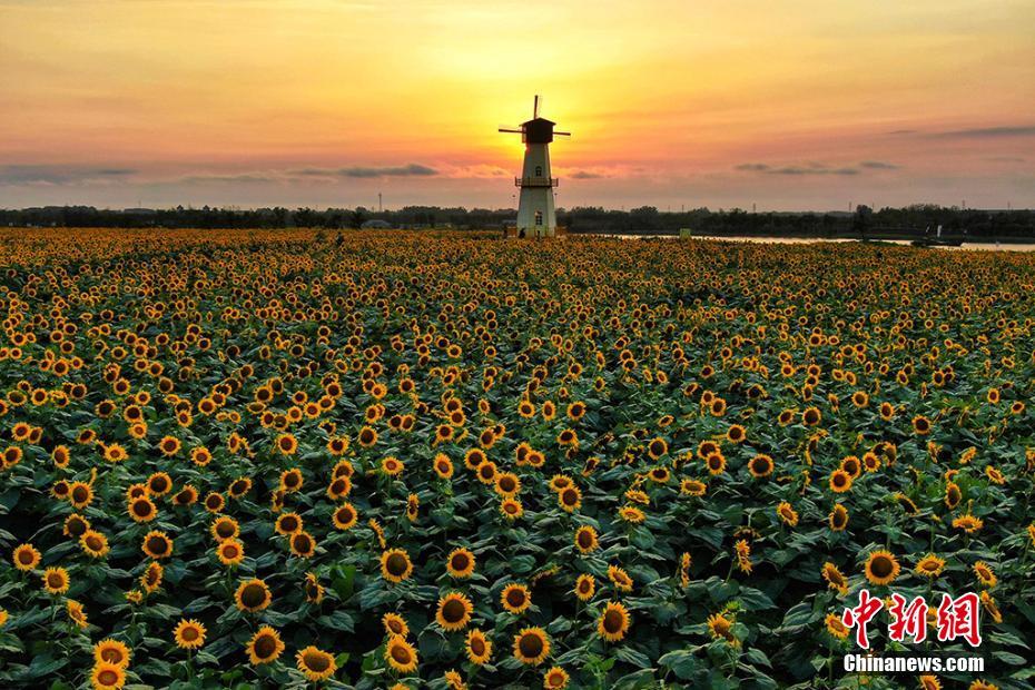 7月6日,航拍江苏淮安白马湖畔1500亩向日葵花海,14个品种的500多万株葵花迎风绽放,吸引了大批民众前来赏葵花。泱波 摄