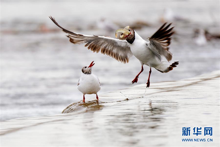 7月6日,在青海省刚察县沙柳河里,一只棕头鸥捕捉到一只跃起的湟鱼。 盛夏时节,在我国最大的内陆咸水湖青海湖中,湟鱼开始成群结队沿着入湖河流逆流而上,到上游淡水河产卵,形成“半河清水半河鱼”的奇观。 新华社记者 刘金海摄