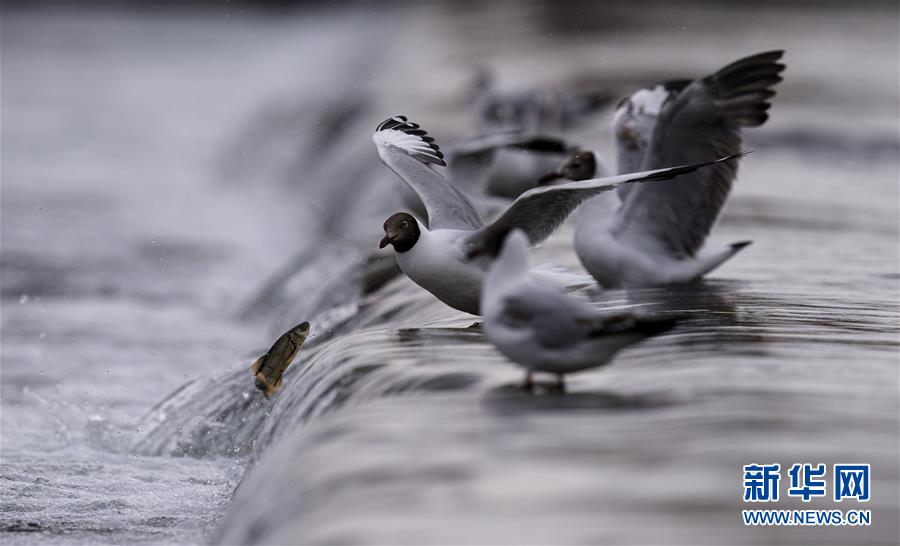 7月6日,在青海省刚察县沙柳河里,几只棕头鸥在等待捕捉跃起的湟鱼。 盛夏时节,在我国最大的内陆咸水湖青海湖中,湟鱼开始成群结队沿着入湖河流逆流而上,到上游淡水河产卵,形成“半河清水半河鱼”的奇观。 新华社记者 费茂华摄