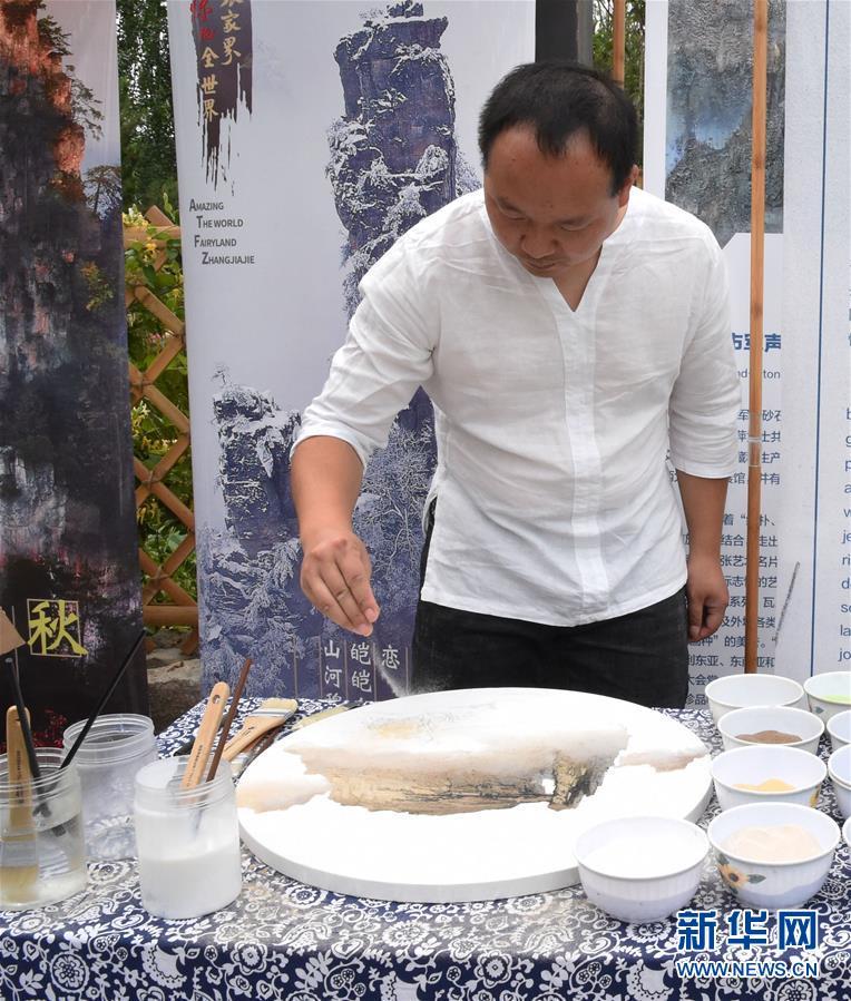 7月7日,工作人员在北京世园会“湖南日”活动中展示砂石画制作。 当日,2019年中国北京世界园艺博览会“湖南日”活动在北京世园会园区举行。 新华社发(任超摄)