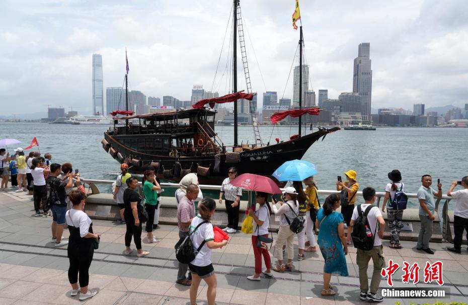 7月9日,众多中国内地游客在香港金紫荆广场附近的海滨观光拍照。随着暑期到来,香港旅游业预计将逐渐升温。中新社记者 张炜 摄